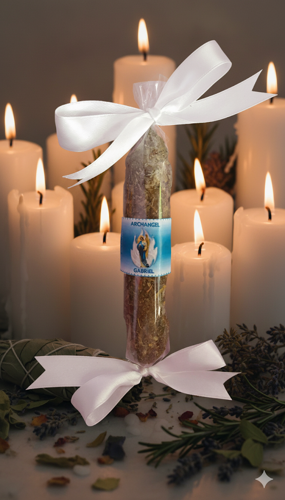 At its core, this candle captures the essence of Archangel Gabriel, the messenger of creativity and divine ideas. The herbs adorning it are carefully chosen to align with Gabriel's vibrational energy, inviting his presence into your space. It serves as a beacon, inviting angelic guidance and purity into your life.