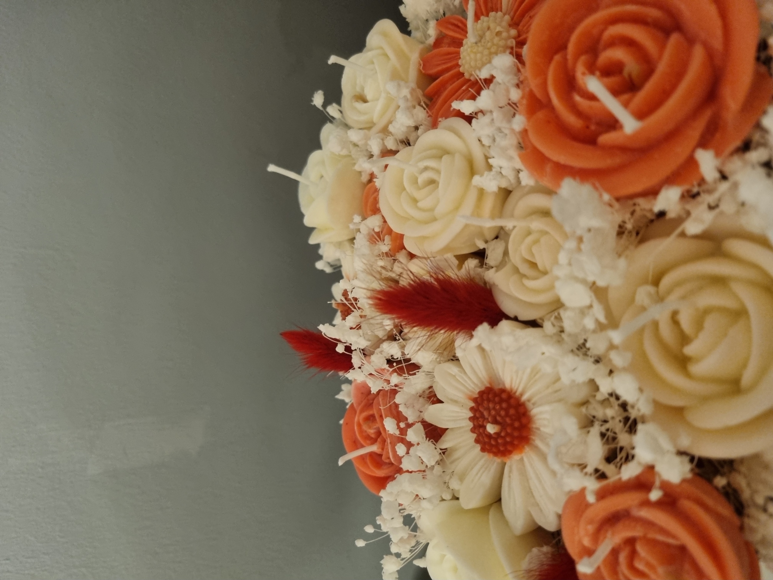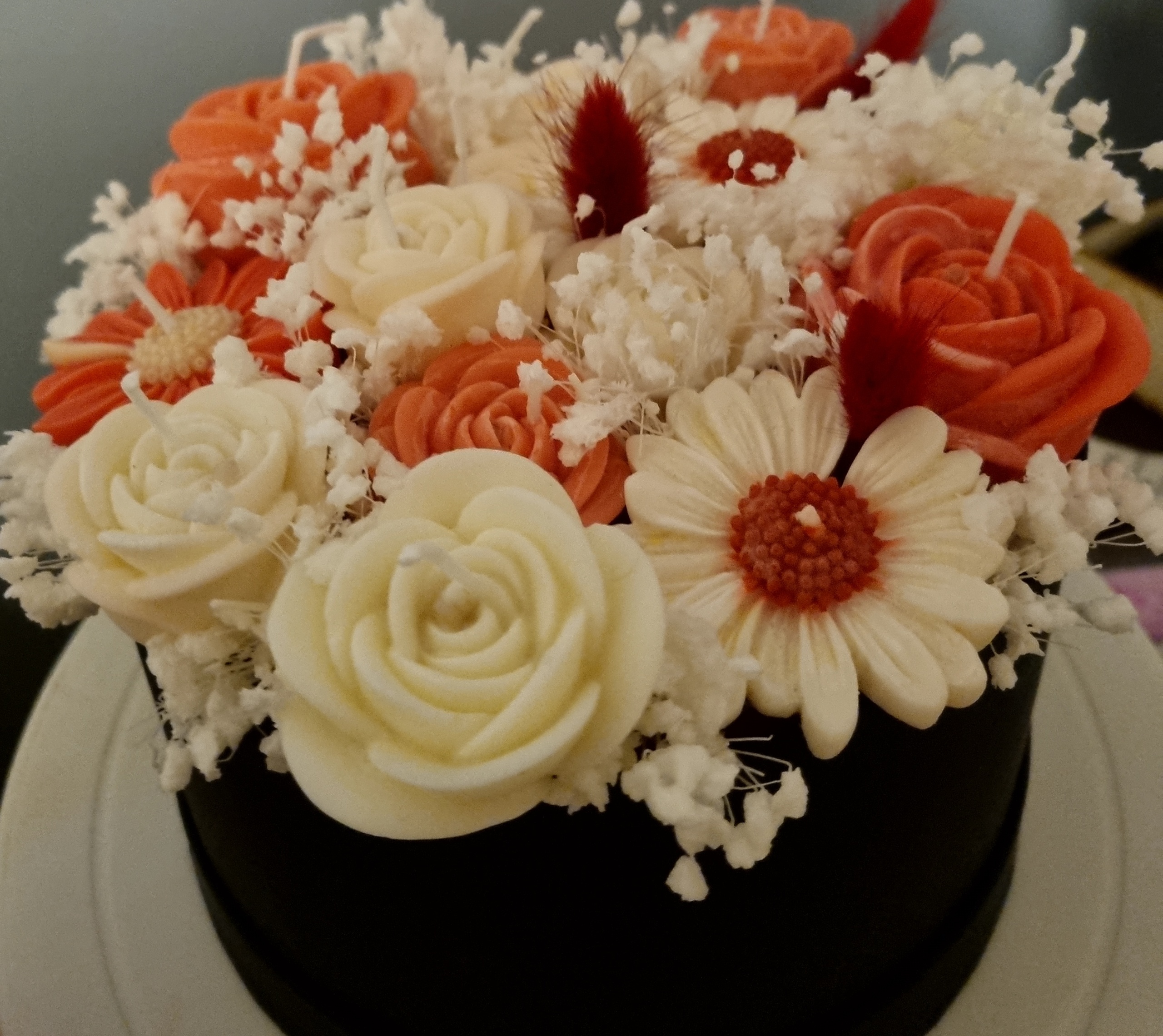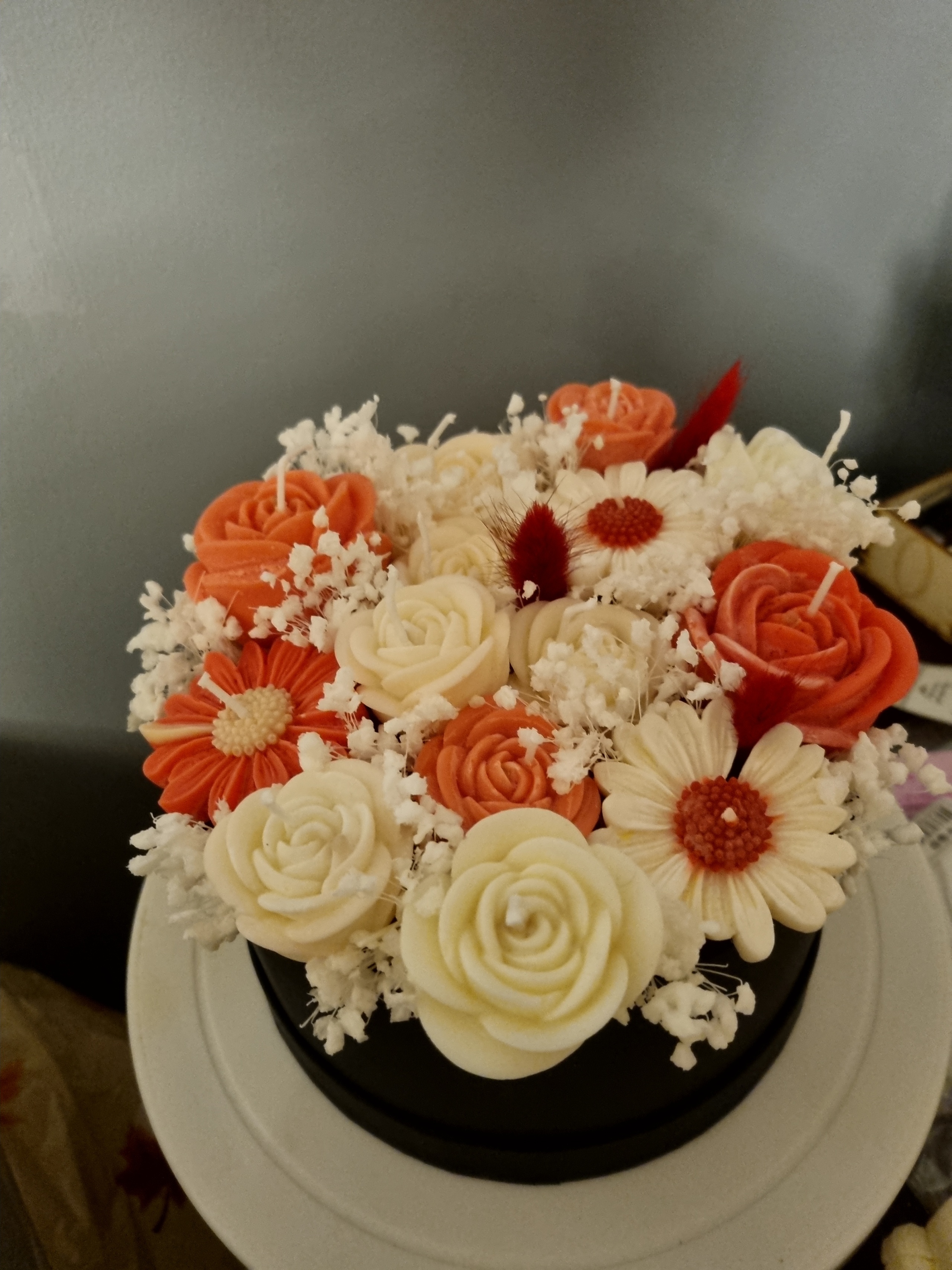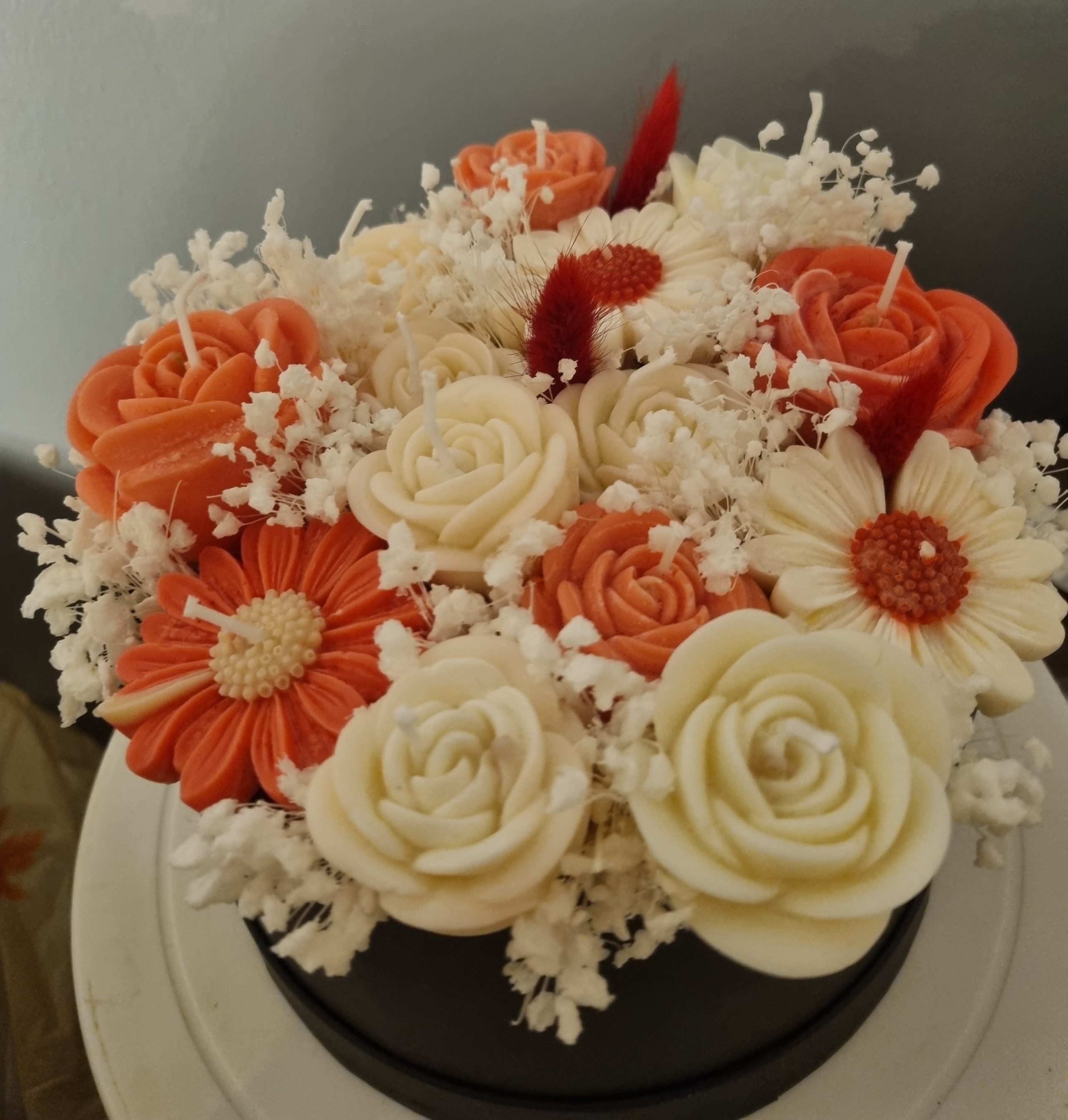 A unique handmade arrangement created with 100% natural soy wax candles, carefully crafted to bring warmth and elegance into any space. The combination of floral shapes and decorative designs makes this box a refined choice for home décor or a thoughtful gift for someone special.