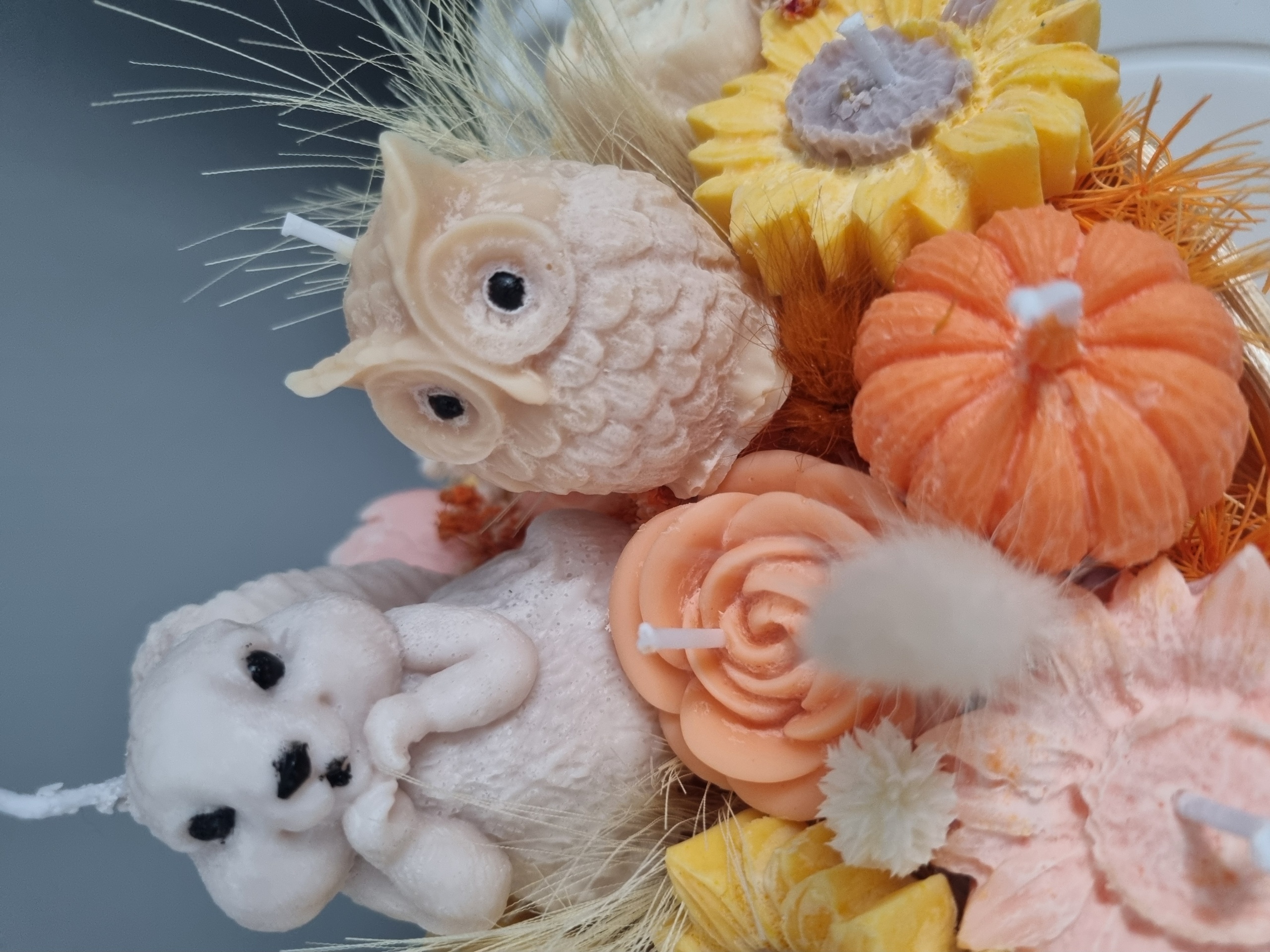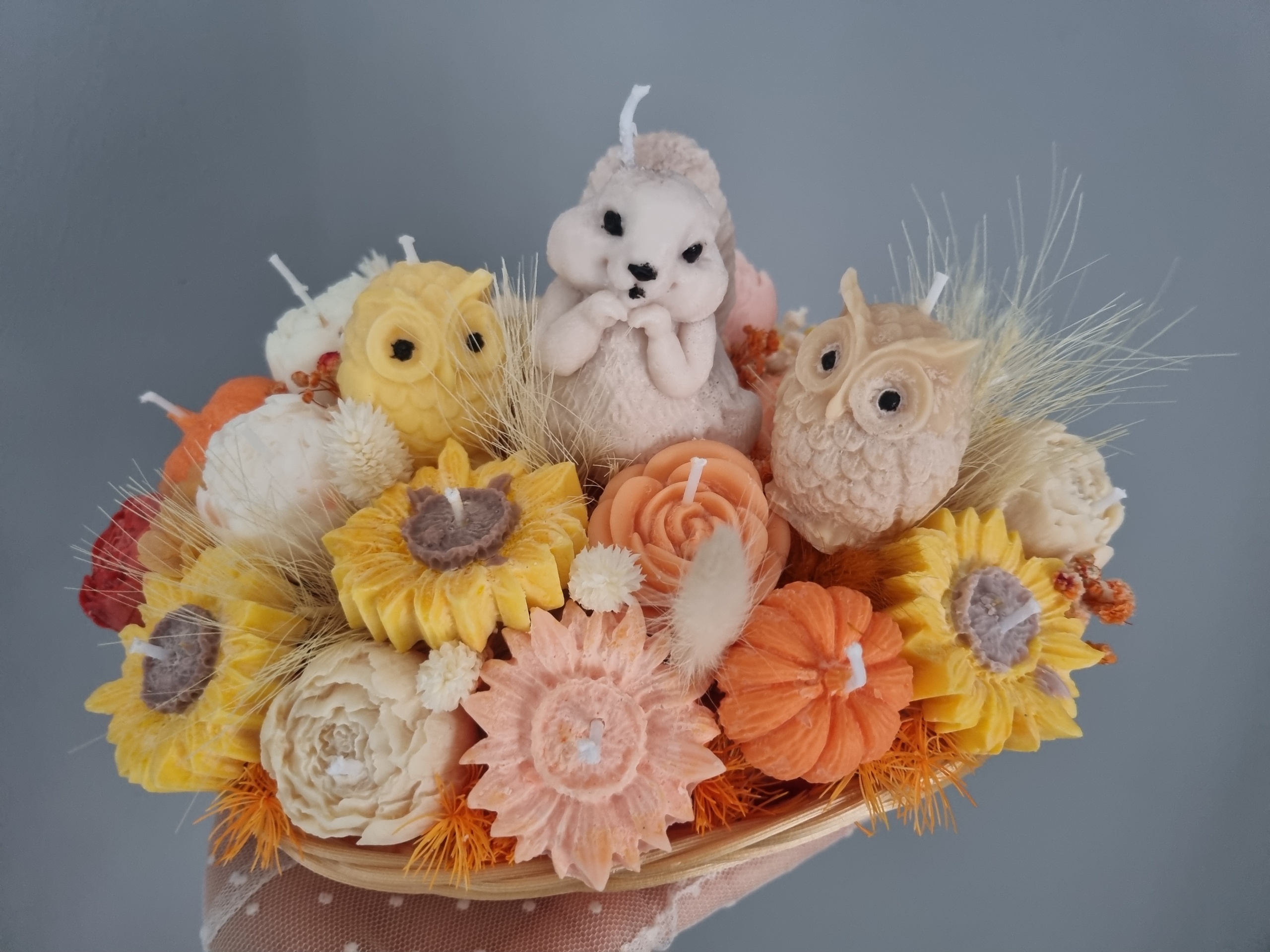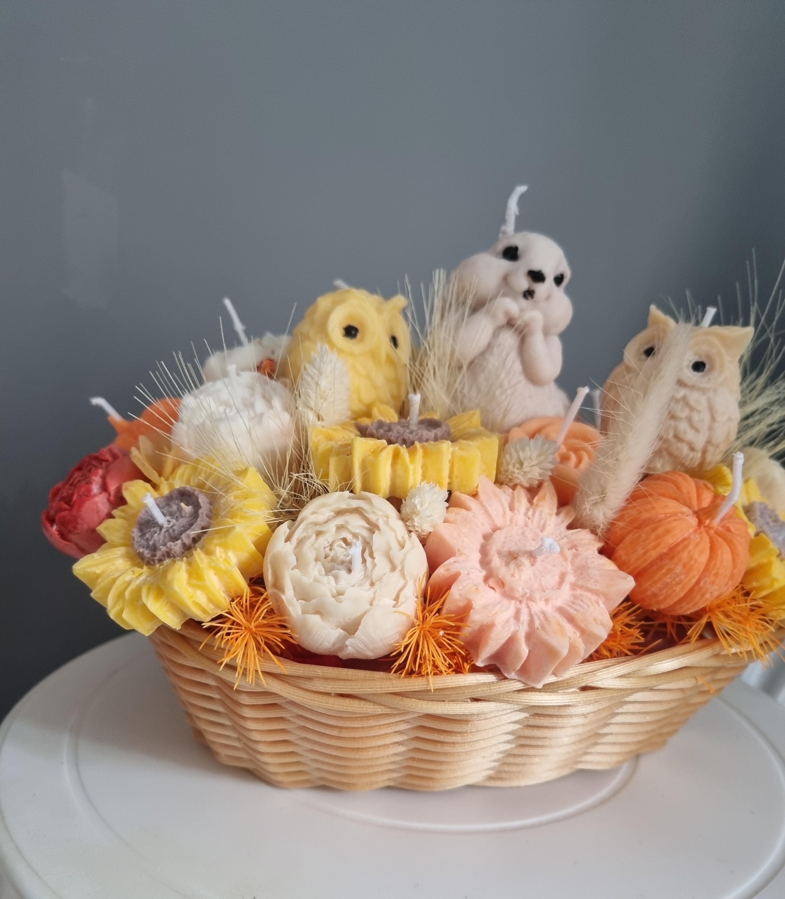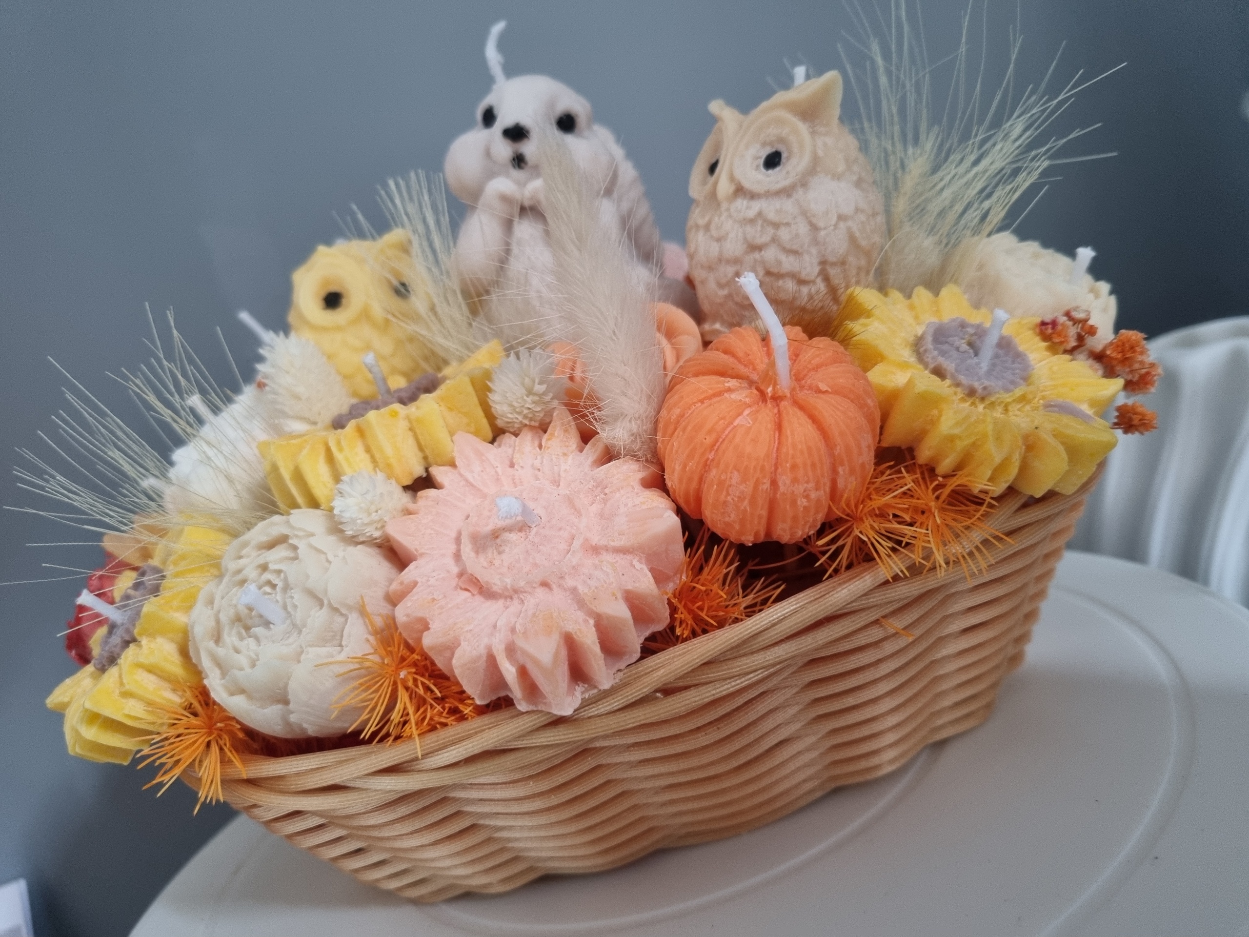 This unique handmade candle basket brings the warmth and charm of autumn into your home. Crafted from 100% natural soy wax, it features delicately sculpted flowers, miniature pumpkins, and adorable figurines shaped like owls and a squirrel.