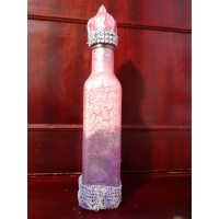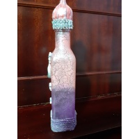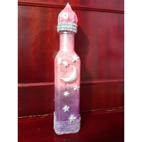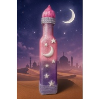 What if you could hold a piece of the Arabian Nights in your hands?   This enchanting square bottle is painted with the timeless craquelure technique, its delicate cracks revealing layers of mystical shades of purple and pink. Adorned with a hand-sculpted crescent moon and stars in clay, shimmering silver strass accents, and a cap that looks as though it was taken straight from the pages of Arabian Nights, it radiates mystery and elegance.   This bottle is not just a dec...